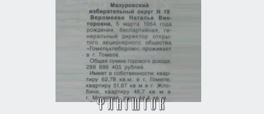 Наталья Веромеева возглавляла «Гомельхлебпром» на протяжении 16 лет. За это время она успела дважды избраться в Гомельской областной Совет депутатов. Благодаря декларациям о доходах, которые подают кандидаты в депутаты, можно примерно представлять сколько зарабатывала Наталья Веромеева на должности директора предприятия.