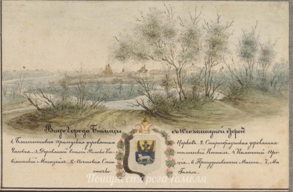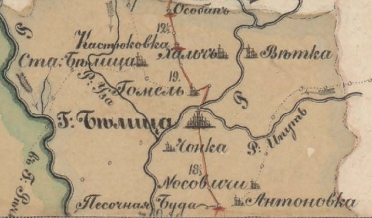- "Присудственные места", паштовая станцыя і сам Гомель (з левага боку на гарызонце) капітальнасцю не адрозніваюцца і прамаляваны без асаблівых падрабязнасцяў