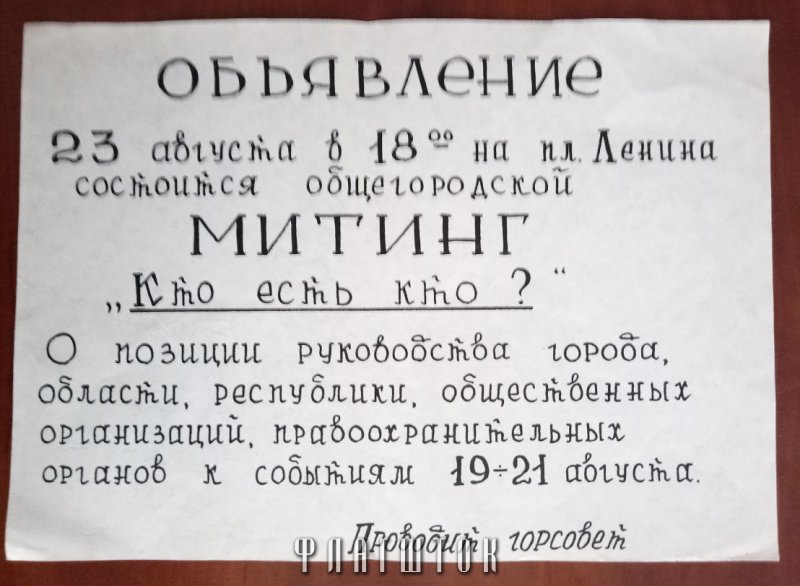 Улётка з запрашэннем на мітынг, які сабраў некалькі тысяч гомельцаў. На мітынгу была прынята рэзалюцыя аб забароне ГКЧП на тэрыторыі Гомеля, а таксама была падтрымана незалежнасць Рэспублікі Беларусь