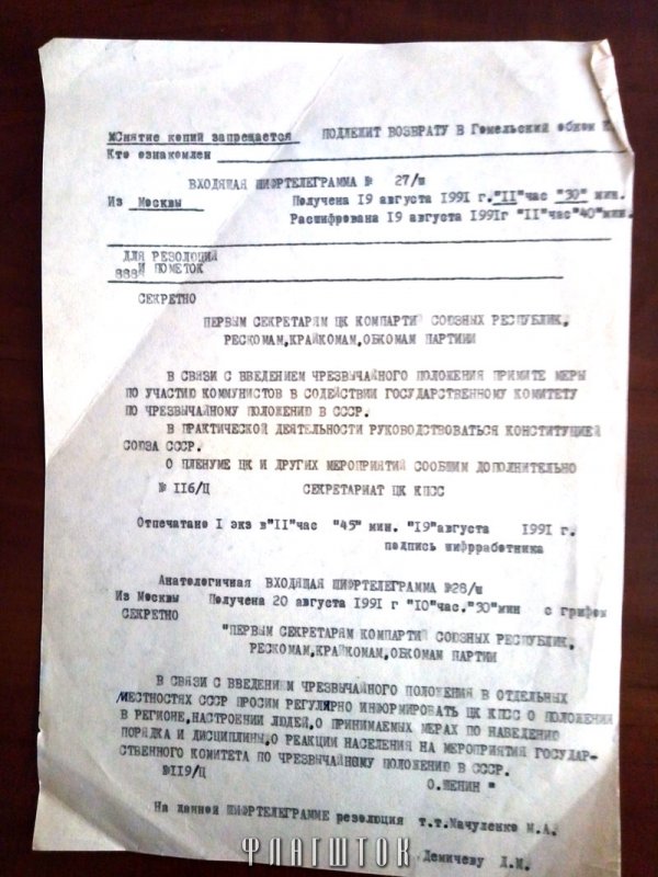 Сакрэтны ліст у Гомельскі абласны камітэт камунісычнай партыі аб увядзенні надзвычайнага становішча ў СССР