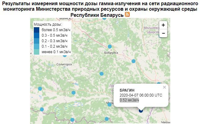 На сегодня по данным сайта уровень радиационного фона в Гомеле и окрестностях составляет 0,10 мкЗв/ч. Превышение верхнего предела допустимой мощности дозы, составляющего 0,5 мкЗв/ч, наблюдается только в Брагине.