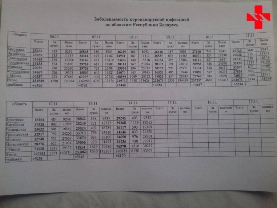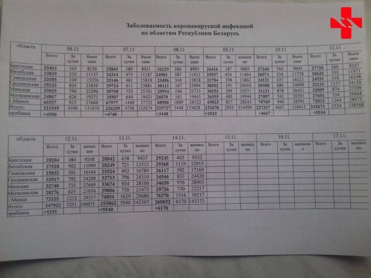 14 ноября 2020 года неофициальный медицинский телеграм-канал «Белые халаты» опубликовал инсайдерскую информацию об уровне заболеваемости COVID-19. Согласно ей по Гомельской области 14 ноября было выявлено 26117 больных COVID-19.