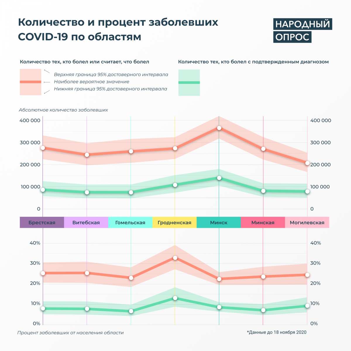 Результаты проведенного исследования показали, что на 18 ноября 2020 года с наибольшей вероятностью в Беларуси с подтвержденным диагнозом переболело 8,4% взрослого населения (это около 635 тыс. человек), а по Гомельской области примерно 7% населения. Эти результаты превосходят официальные данные Минздрава примерно в 10 раз.