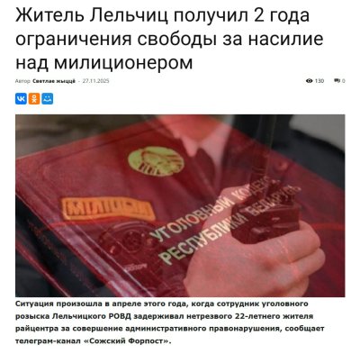 Асаблівасці правасуддзя ў Беларусі: жыхару Лельчыц далі «хімію» за гвалт у адносінах да міліцыянера Мясцоваму міліцыянеру ён нанёс некалькі ўдараў у вобласць грудзей і хапаў яго рукой за горла. Суд не ўбачыў у гэтай справе «палітыкі» і не стаў заключаць грамадзяніна пад варту: 2 гады абмежавання волі з накіраваннем у выпраўленчую ўстанову адкрытага тыпу, а таксама абавязаў выплаціць міліцыянеру грашовую кампенсацыю за прычыненую маральную шкоду. Пра гэта паведаміла Лельчыцкая раёнка. Іншая справа — калі грамадзянін вырашыць нешта пракаментаваць у інтэрнэце. Тут усё залежыць ад фантазіі абвінавачвання і стараннасці суддзі. t.me/flagshtok