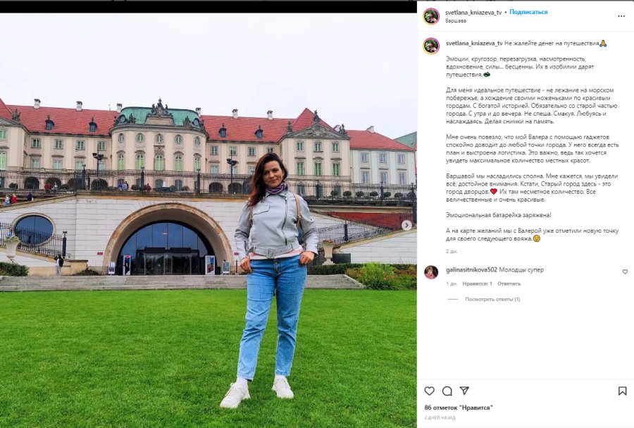 Але, мяркуючы па фотаздымках, якія яна размясціла на сваёй старонцы ў Інстаграм, адпачываць «для перазагрузкі» Князева ездзіць у еўрапейскія краіны «па прыгожых гарадах з багатай гісторыяй». У апошнія месяцы яна апублікавала справаздачу з краінаў, якія якраз і дэманізуе беларуская прапаганда — Польшчы і Літвы. Яна захапляецца старой архітэктурай, добраўпарадкаваннем. На адным з фотаздымкаў з Вільні яна напісала: «лёгкасць, свабода, творчасць — на кожным кроку».