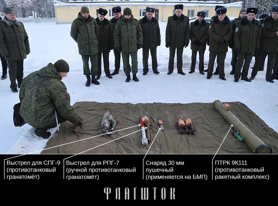 Среди продемонстрированных взрывоопасных предметов противотанковый ракетный комплекс «Фагот», выстрелы для противотанковых гранатометов (СПГ-9 «Копье» и РПГ-7) и 30-миллиметровый пушечный снаряд для БМП. Все эти вооружения применяются российской армией и сегодня, в том числе на территории Украины.