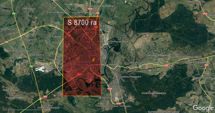 Наглядное представление площади в 8 700 Га (87 квадратных километров)