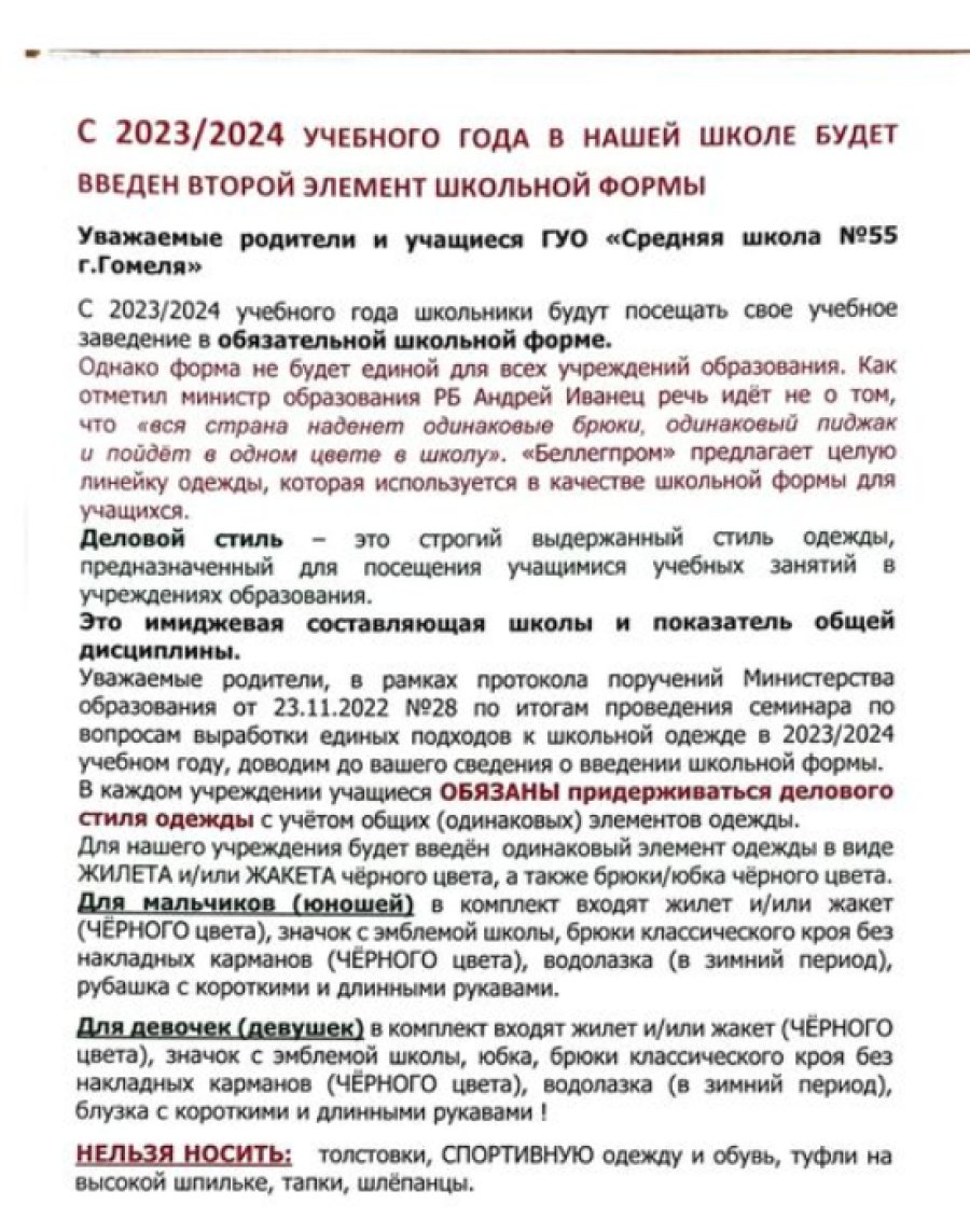 Школьная форма не будет единой для всех беларусских школ. Школьным администрациям дано право определять свой дресс-код. Например, администрация гомельской СШ № 55 сообщила родителям о том, что с 1 первого сентября школьники обязаны носить жилет и/или жакет черного цвета.