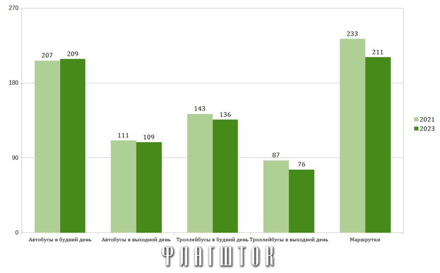 Сопоставление данных показывает, что за прошедшее время нехватка транспортных средств стала для города еще более серьезной проблемой. Если в 2021 году в будний день на линию выходило 350 автобусов и троллейбусов, то нынче — 345. Сокращение единиц транспорта в выходной день еще более ощутимо — 185 единиц против 198 в 2021 году.