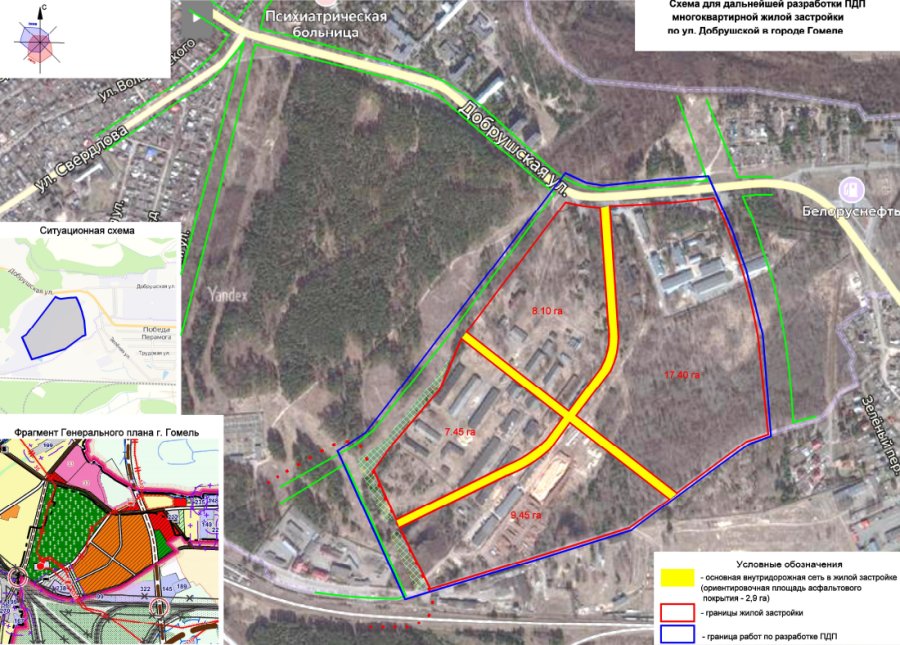 УКС города Гомеля объявило о выборе проектной организации для разработки детального плана многоквартирной застройки по улице Добрушской (территория бывшего военного городка). Данный земельный участок находится в границах ул. Добрушская — элемент магистрали «Восточный обход» — улица Дорожная — граница земель Гомельского района (пос. Победа). Заказчиком проекта является управление архитектуры и градостроительства Гомельского горисполкома.