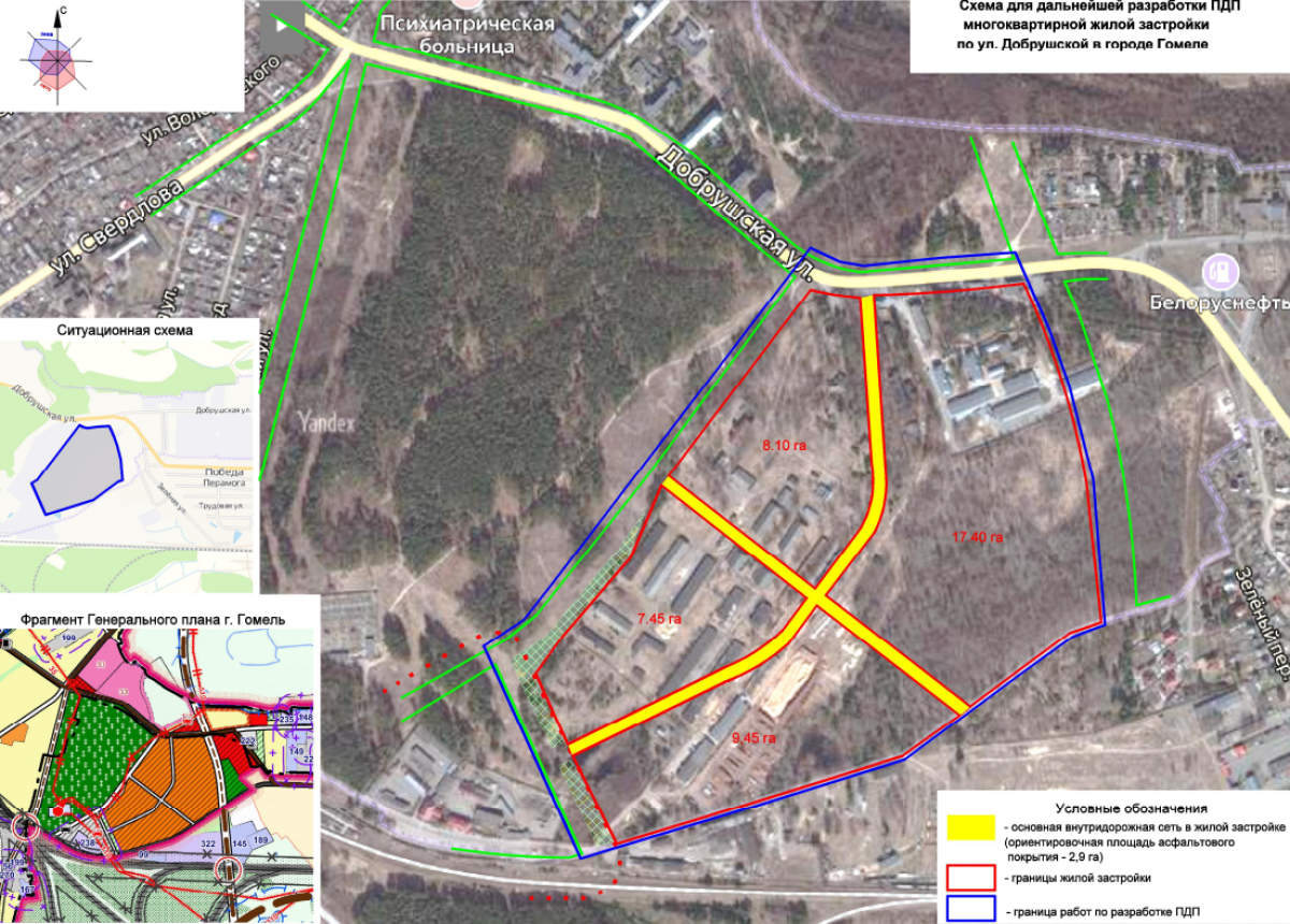 Перед проектировщиками поставлена задача разработать план застройки и функциональное зонирование территории в соответствии с действующим генеральным планом Гомеля. При разработке необходимо также учесть разработанный проект детального планирования в районе ул. Добрушской (расположен по соседству) и тот факт, что в границах проекта находится квартал леса «Кореневской экспериментальной базы».