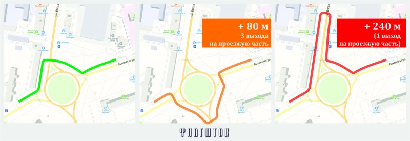 На пропускную способность ликвидация переходов тоже не повлияет. Вероятно, были опасения, что после открытия магазина через них пойдёт непрерывный поток людей и перекроет автомобилям доступ на кольцо, но это решается простейшим разграничением потоков: те, кому надо на остановку и в сторону поликлиник, могут, как и раньше, переходить по нерегулируемым переходам у кольца. Число таких пешеходов особенно не изменится. Те, кому нужно в магазин, могут пользоваться регулируемыми переходами чуть дальше — расстояние для них будет таким же, а дополнительную нагрузку на нерегулируемые переходы они не создадут. Кроме того, на улицах с ликвидированными переходами на подъездах к магазину теперь есть светофоры, которые при правильной настройке прекрасно справятся с дозированием автомобильного трафика на кольцо и позволят избежать пробок.