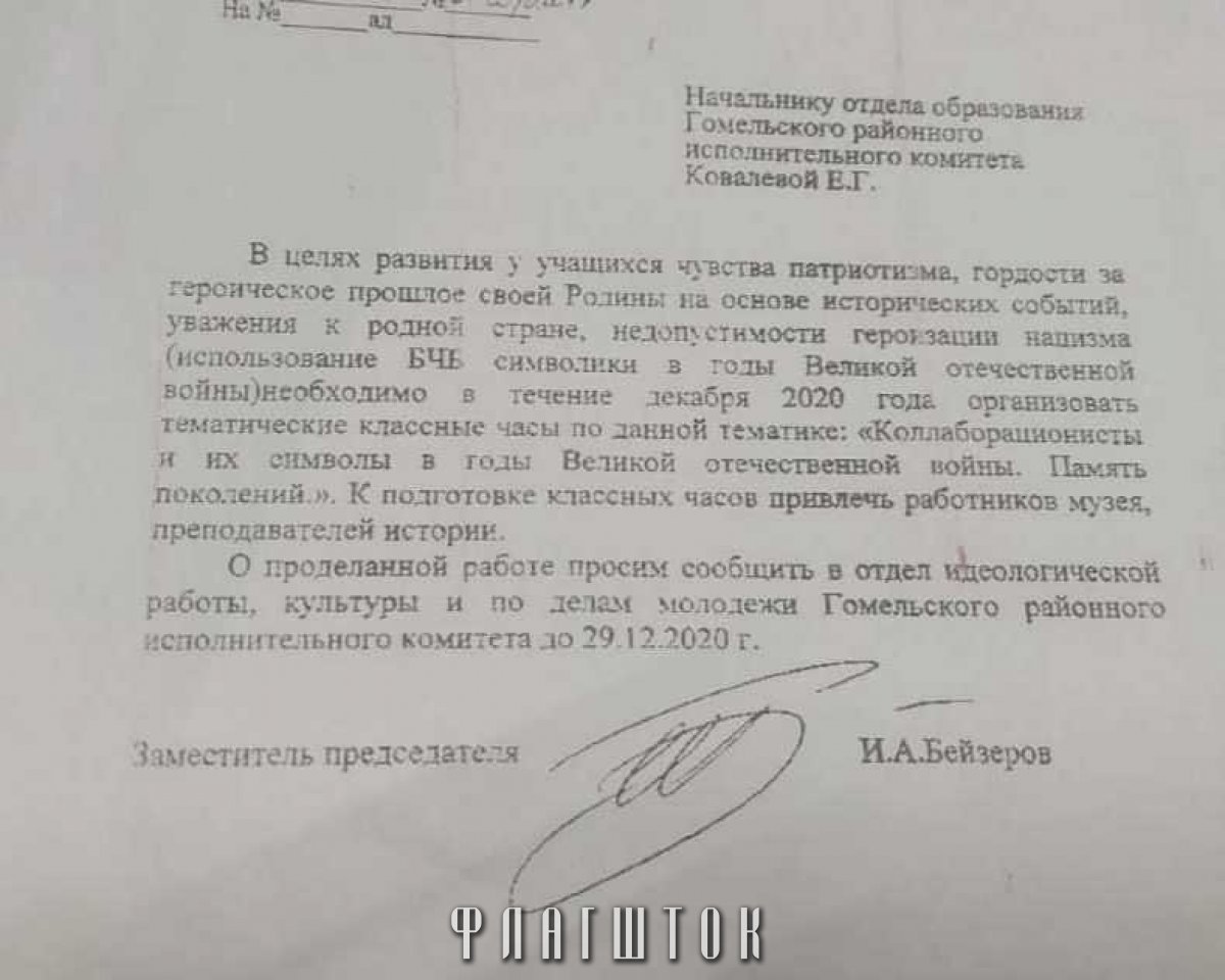 «В целях развития у учащихся чувства патриотизма, гордости за героическое прошлое своей Родины на основе исторических событий, уважения к родной стране, недопустимости героизации нацизма (использование БЧБ символики в годы Великой Отечественной войны) необходимо в течение декабря 2020 года организовать тематические классные часы по данной тематике: Коллаборационисты и их символы в годы Великой Отечественной войны», — говорится в распоряжении идеолога, зампредседателя Гомельского райисполкома Игоря Бейзерова.