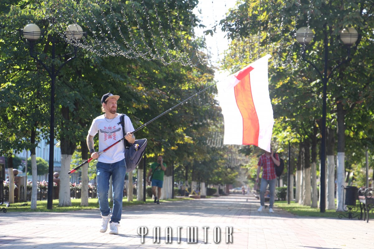 Бело–красно–белый флаг — национальный символ белорусского народа. Автором проекта БЧБ является архитектор Клавдий Дуж–Душевский, создавший в соответствии с геральдическими правилами знакомый всем белорусам стяг в 1917 году. Создатель бело–красно–белого флага в годы ІІ Мировой войны отказался сотрудничать с нацистами, спас и удочерил еврейскую девочку, за что попал в концлагерь. В течение 1991 по 1995 гг. БЧБ являлся государственным флагом, под которым принимали присягу военные и милиция. В 1995 году на сомнительном с точки зрения легитимности референдуме БЧБ был заменен на модифицированную сталинскую символику БССР.