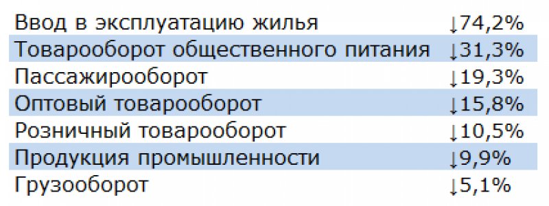 Самое большое падение наблюдается в строительной сфере. Ввод в эксплуатацию жилья сократился в четыре раза.