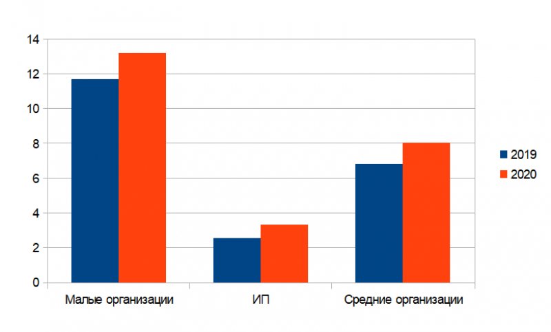 Несмотря на общий спад экономики, доля налоговых поступлений от малых предприятий выросла с 11,7% до 13,2%. Вклад индивидуальных предпринимателей в налоговые поступления бюджета увеличился с 2,5 % до 3,3%. Удельный вес налоговых поступлений средних организаций по сравнению с прошлым годом увеличился на 1,2 процентных пункта.
