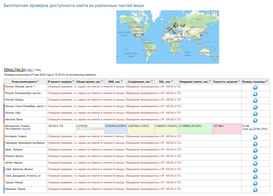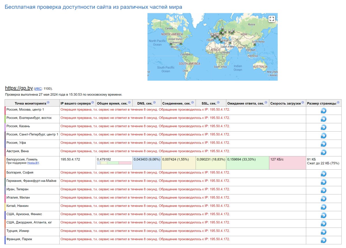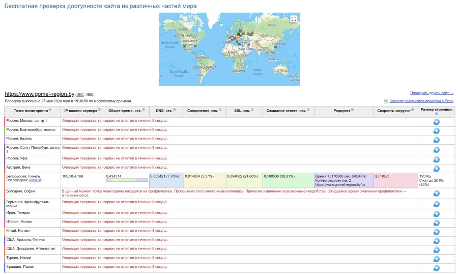 Так выглядит география доступа к сайту Гомельского облисполкома (по данным сервиса ping-admin.com)