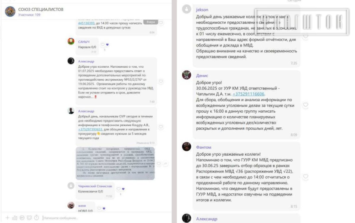 В переписках милиционеры Гомельской области выкладывали не только материалы о кражах, но и документы, которые касаются отчетов по работе с «тунеядцами», о «противодействии экстремизму».