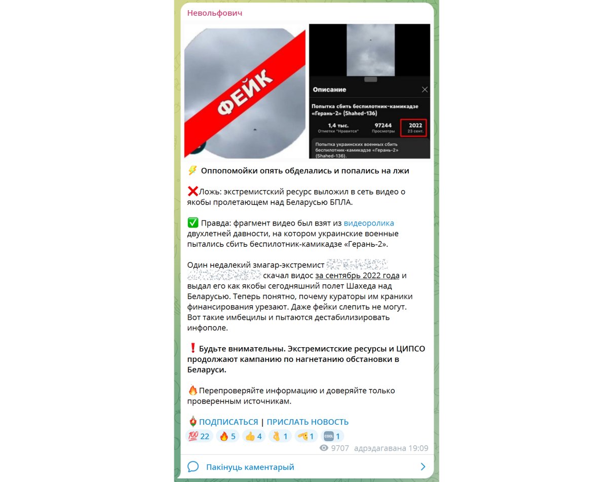 Подобную стратегию можно проиллюстрировать. Третьего октября российский Шахед упал в Калинковичах и перепугал жителей города и соседних деревень. Тг-канал Невольфович, связанный с силовыми ведомствами, сообщил о фейковом видео пролета БпЛА над городом. На тот момент информация о причине взрыва в жилой застройке в Калинковичах силовикам была хорошо известна. Но попытка опровергнуть падение дрона и взрыв была сделана.