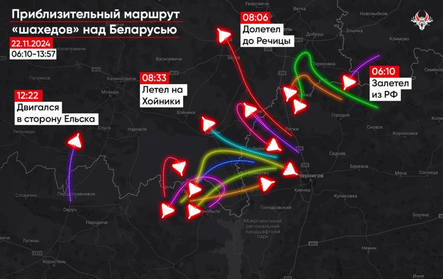 Типичная картина перемещний российских БпЛА, прилетевших из Украины, через территорию Беларуси по данным мониторингового канала Беларускі Гаюн на 22 ноября 2024 года