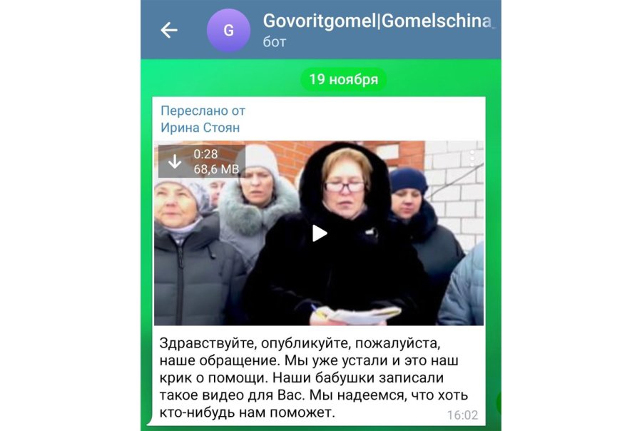 Первое сообщение содержит фальшивый ролик жителей деревни Верхние Жары Брагинского района Гомельской области к председателю Гомельского облисполкома Ивану Крупко. Они жалуются на пролеты БпЛА.