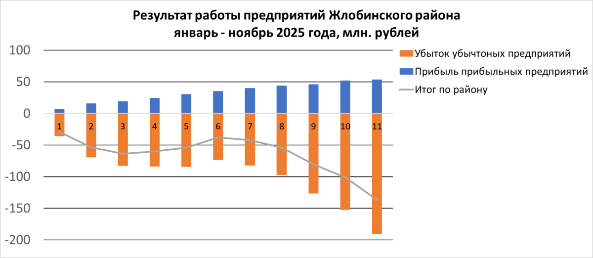 По данным статистики, к началу декабря 2025 года результат работы всех организаций Жлобинского района составил –136,7 млн рублей. При этом график динамики показывает характерную деталь: рост убытков происходит не постепенно, а c ускорением во второй половине года. Основной вклад в отрицательный результат формируют убыточные предприятия — их суммарный минус к ноябрю превысил 190 млн рублей.