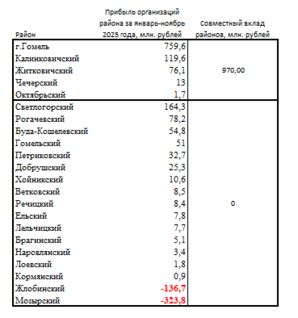 Сводные данные по Гомельской области за январь–ноябрь 2025 года демонстрируют сильную асимметрию. Большинство районов и областной центр работают с прибылью. Только город Гомель показал плюс 759,6 млн рублей, Калинковичский район — 119,6 млн, Светлогорский — 164,3 млн. Однако этот результат во многом нивелируется двумя промышленными узлами: Мозырский район — минус 323,8 млн рублей (МНПЗ), Жлобинский район — минус 136,7 млн рублей (БМЗ).