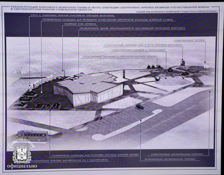Помимо огромных затрат на строительство «комплекса воинской славы», по сути, идеологической площадки в Светлогорском районе, из госбюджета потратят крупную сумму на созданию постоянной экспозиции в трех залах здания информационного обслуживания.