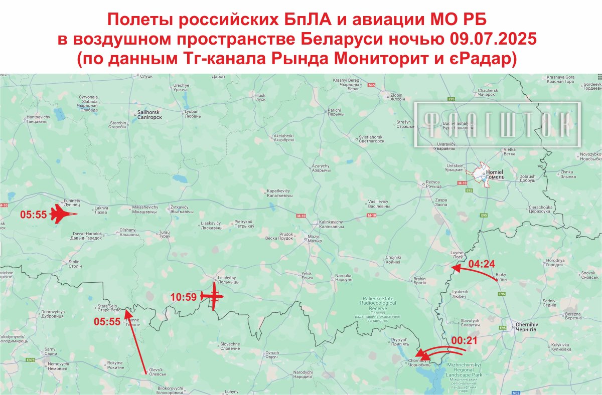 По данным украинского мониторингового канала Рында Монитоит, в воздушном пространстве Беларуси ночью 9 июля вновь пребывали ударные четыре БпЛА. Три из них зашли по привычной траектории с Черниговщины через Днепр на Гомельщину: в 00:21 два пролетели транзитом через Брагинский район, в 04:24 один залетел в Лоевский район.