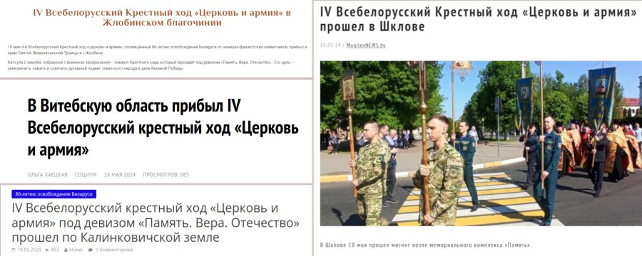 Новую религиозно-патриотическую акцию организовали в Беларуси, запустив в Гомеле 8 мая IV Всебеларусский Крестный ход «Церковь и армия». Проводят с целью «увековечить память и освятить духовный подвиг советского народа в деле Великой Победы».