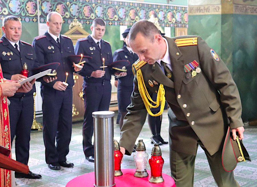 Силовики и священники молятся над капсулой с землей. Фото: Гомельская епархия
