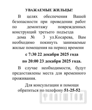 Покинуть квартиры дома по ул. Косарева необходимо на два дня — с утра 22 декабря до вечера 23 декабря — на время демонтажа повреждённых плит.