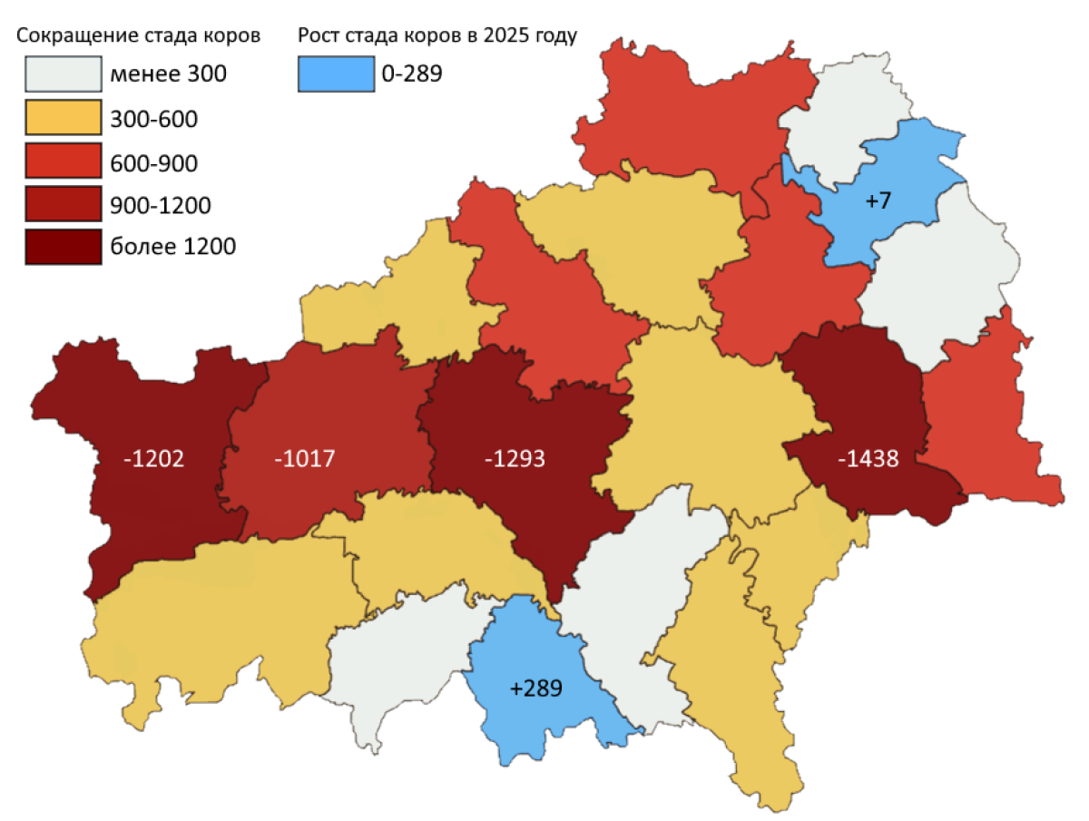 С сокращением общего поголовья коррелирует динамика основного молочного ресурса: число коров упало на 10 932 головы (–5,39%). Это почти вдвое превышает темпы снижения 2024 года, когда падение составило –2,94%.