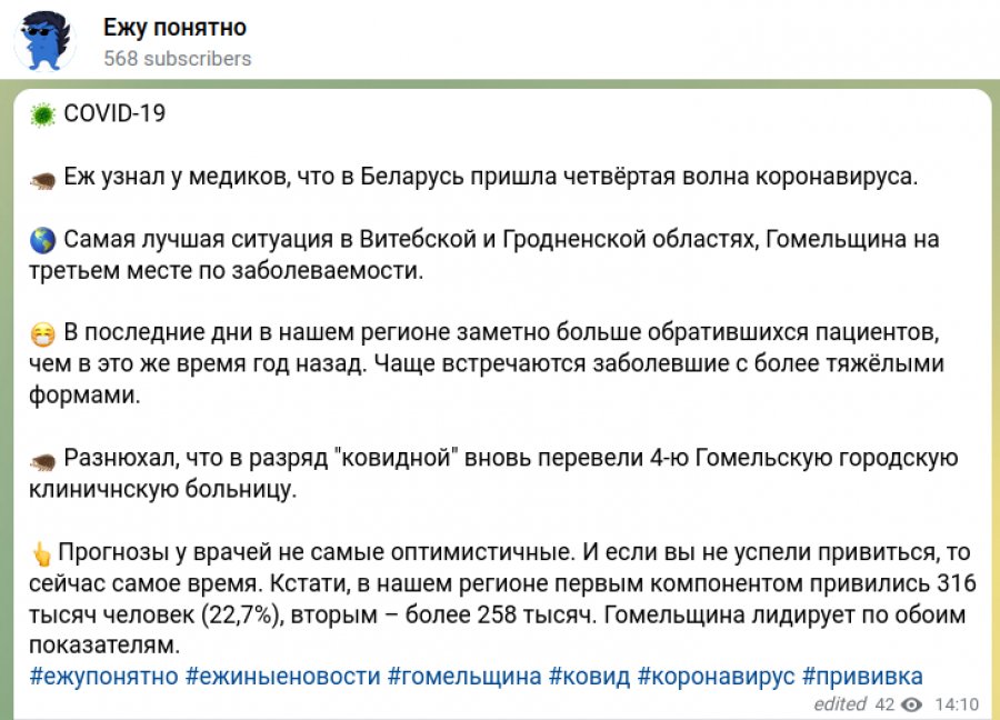 Со ссылкой на медиков неофициальный Телеграм-канал газеты Гомельского облисполкома сообщил 13 сентября, что в Беларусь уже пришла четвертая волна коронавируса. Как говорится в информации, «самая лучшая ситуация в Витебской и Гродненской областях, Гомельщина на третьем месте по заболеваемости».