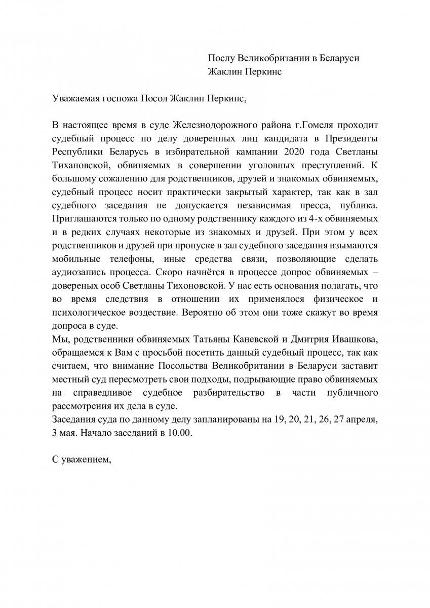 Родственники политзаключённых, которых сейчас судят в Гомеле, позвали на предстоящие процессы послов Польши, Велокобритании, Украины, Италии, Латвии, Германии, Франции и Литвы. Они надеются, что это хоть как-то поможет попасть на официально открытый процесс и заставит гособвинение и судей вести себя более объективно.