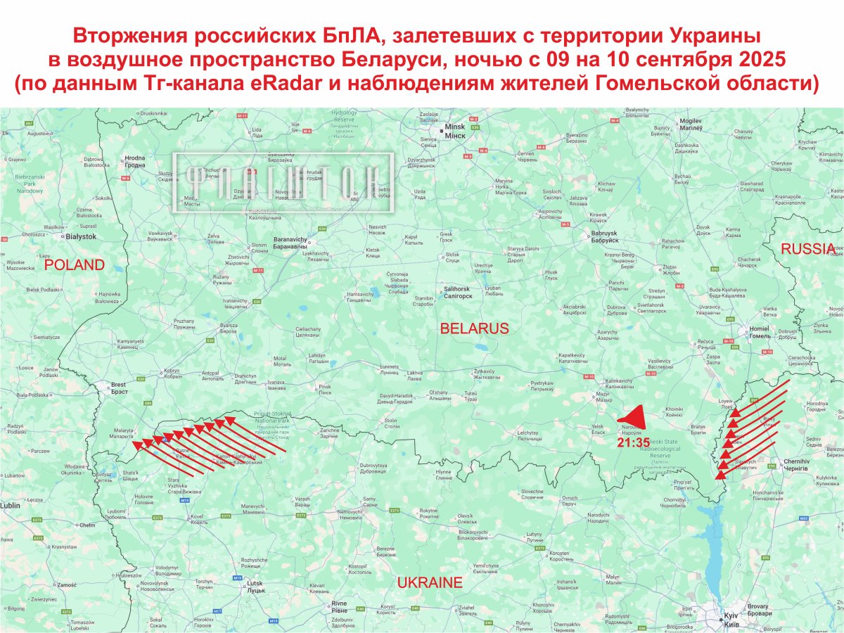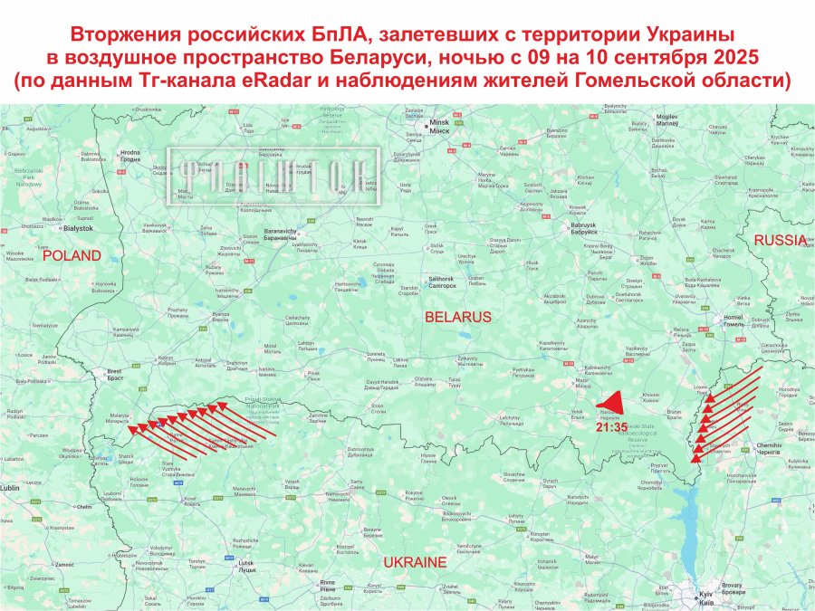 Инфографика Флагштока: Вторжения российских БпЛА, залетевших с территории Украины в воздушное пространство Беларуси, ночью с 09 на 10 сентября 2025 (по данным Тг-канала eRadar и наблюдениям жителей Гомельской области)