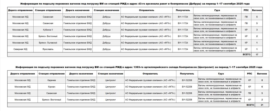 На станцию Центролит в Гомеле в адрес 1393-го артиллерийского склада боеприпасов (В/Ч 52208) со станций Московской ЖД был отправлен 21 порожний вагон, из них 16 крытых вагонов и 5 полувагонов.