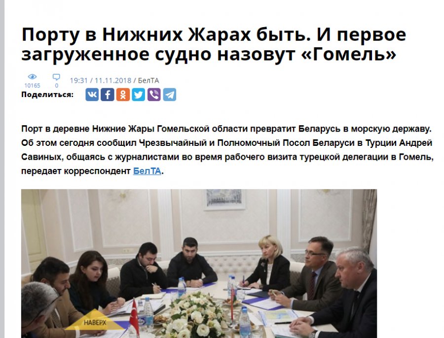 Однако, та же география, что заперла Беларусь посреди Европы, неожиданно послала ей луч надежды. 11 ноября 2018 года Чрезвычайный и Полномочный Посол Республики Беларусь в Турции Андрей Савиных заявил, что Беларусь при участии турецкого инвестора планирует построить речной порт на Днепре в Гомельской области вблизи границы с Украиной. «Наши турецкие партнеры рассматривают возможность строительства порта в Нижних Жарах Брагинского района, который превратит Беларусь в морскую державу», — сообщил Савиных журналистам в Гомеле в ходе визита турецкой делегации в областной центр. Для реализации проекта будет построен портовый терминал на Днепре в деревне Нижние Жары, что на границе с Украиной. В качестве инвестора выступает турецкая компания Derin Shipping & Trading Co. По словам Андрея Савиных, новый порт будет использоваться для выхода в Черное море судов класса «река-море».