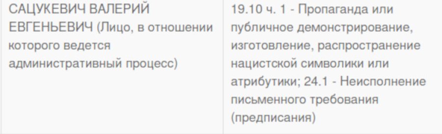 Кроме того, Валерия Сацукевича будут судить по ст. 24.1 «Неисполнение письменного требования (предписания)», как указано в расписании суда.