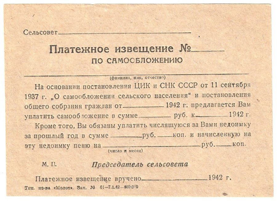 Форма платежного извещения по самообложению в 1942 году. Фото: Википедия