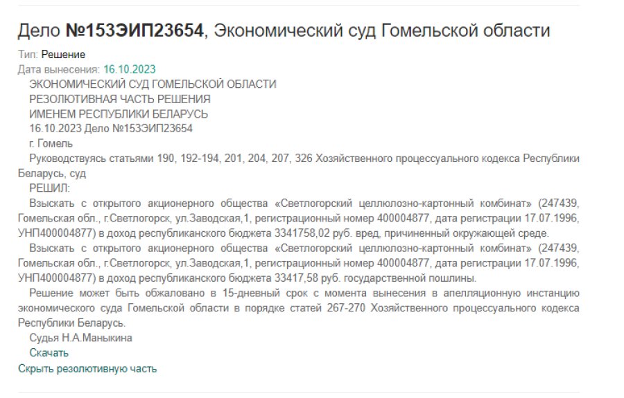 16 октября Экономический суд Гомельской области вынес решение о взыскании со Светлогорского ЦКК 3 341 758 BYN за вред причиненный окружающей среде. Согласно действующим таксам Минприроды, размер установленного штрафа соответствует выбросу в атмосферный воздух примерно 1 тонны загрязняющий веществ наивысшего класса опасности.