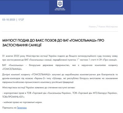 Минюст Украины указывает, что причиной иска стало то, что дочерние компании холдинга "Гомсельмаш" привлечены к производству комплектующих для боеприпасов и дронов-камикадзе под названием "Герань-2" типа "Шахед", которые Беларусь производит по заказу предприятий военно-промышленного комплекса России.