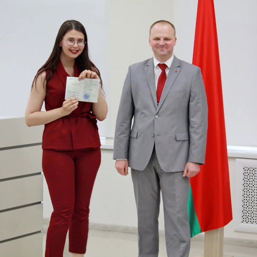 Новый главный редактор «Маяка» Виктория Футрина получает сертификат прохождения курсов журналистики от главного идеолога Гомельской области Дмитрия Езерского в 2022 году, фото: соцсети