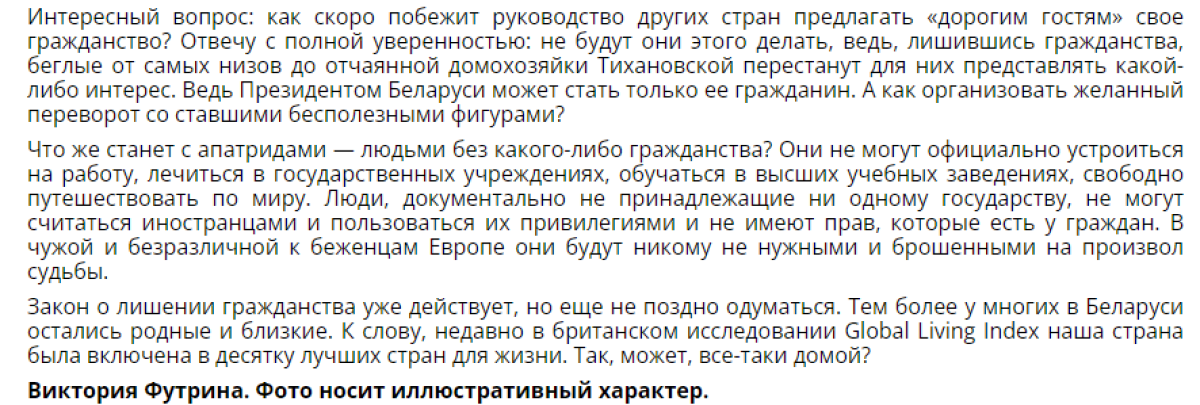 Изучение текстов Футриной показывает, что она уже состоялась как прорежимная пропагандистка. Эмигрировавших беларусов она называет отщепенцами и бомжами, в подробностях описывает правовой режим эмигрантов в Европе, который является абсолютным вымыслом.