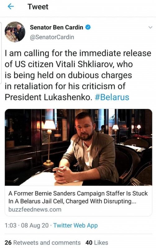 Американский сенатор Бен Кардин обратился к белорусским властям на своей странице в твиттере: «Я призываю немедленно освободить гражданина Соединенных Штатов Виталия Шклярова, которого удерживают по сомнительным обвинениям за критику президента Лукашенко».