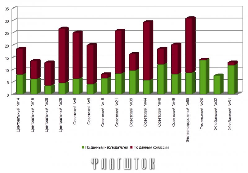Самые удивительные вещи происходят на избирательном участке № 44 в Советском районе, № 65 в Железнодорожном и № 29 Центрального района. Здесь данные комиссии и наблюдателей расходятся на 22—23% от общего числа избирателей. Лидером по удельному весу проголосовавших является 65-й избирательный участок в Железнодорожной районе, где по официальным данным уже проголосовал 31% избирателей. При этом наблюдатели зафиксировали присутствие на избирательном участке менее 9%.