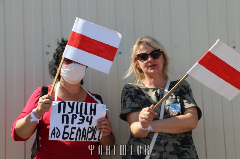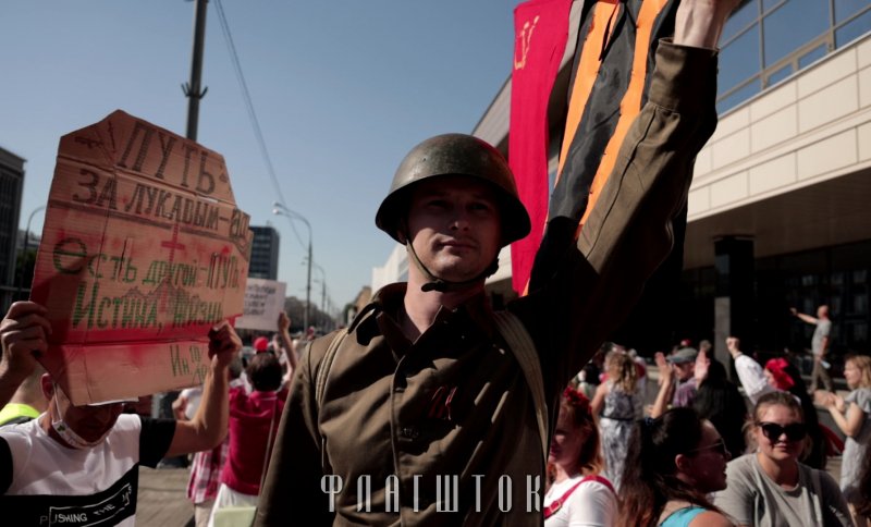 Далее (напротив облисполкома), на пути протестующих стоял мужчина в форме красноармейца с советскими знаменами и флагом экстремистского российского Национально-освободительного движения. Протестующие попросили его не разжигать конфликт, как на востоке Украины.