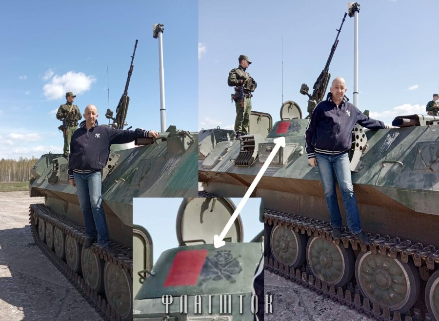 Машина управления артиллерийской батарей на базе МТ-ЛБ с тактическим знаком ВС РБ в виде красного квадрата и закрашенным номером