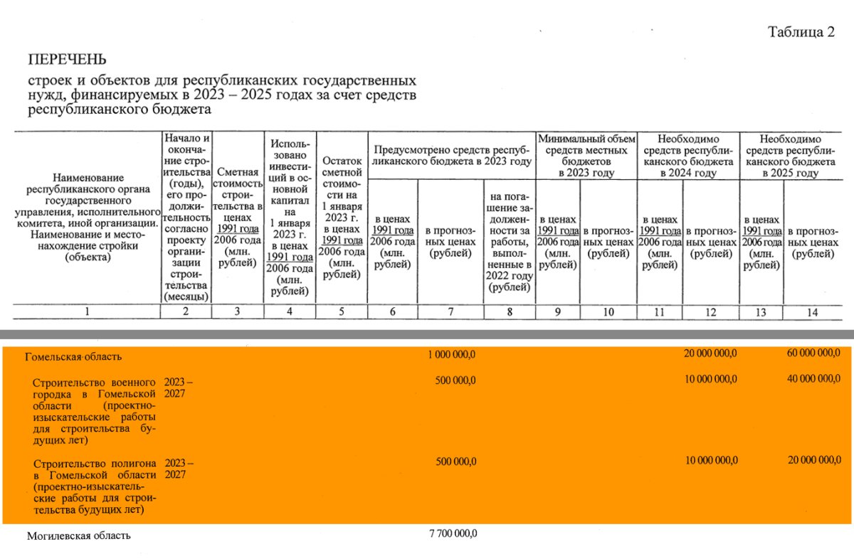 Телеграм канал «Позірк» заметил, что в новой государственной инвестиционной программе на 2023 год содержится информация о создании в Гомельской области новых военных объектов: военного полигона и военного городка. Работы по их созданию запланированы уже в этом году.