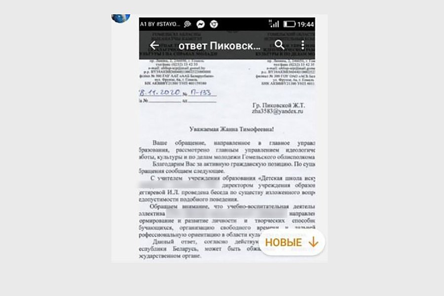 Ответ главного управления идеологической работы Гомельского облисполкома Пиковской